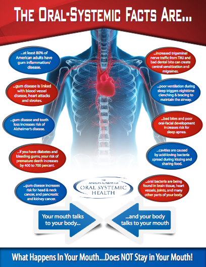 - Bacteria in your mouth travel to other parts of your body in your bloodstream. -American Academy for Oral Systemic Health